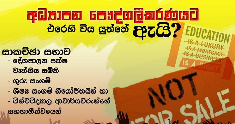 ‘අධ්යාපන පෞද්ගලීකරණයට එරෙහිවිය යුත්තේ ඇයි?’ යන තේමාව යටතේ අන්තර් විශ්වවිද්යාලයීය ශිෂ්ය බලමණ්ඩලය විසින් සංවිධානය කළ සාකච්ඡා සභාවක් පසුගියදා කොළඹදී පැවතුණා.